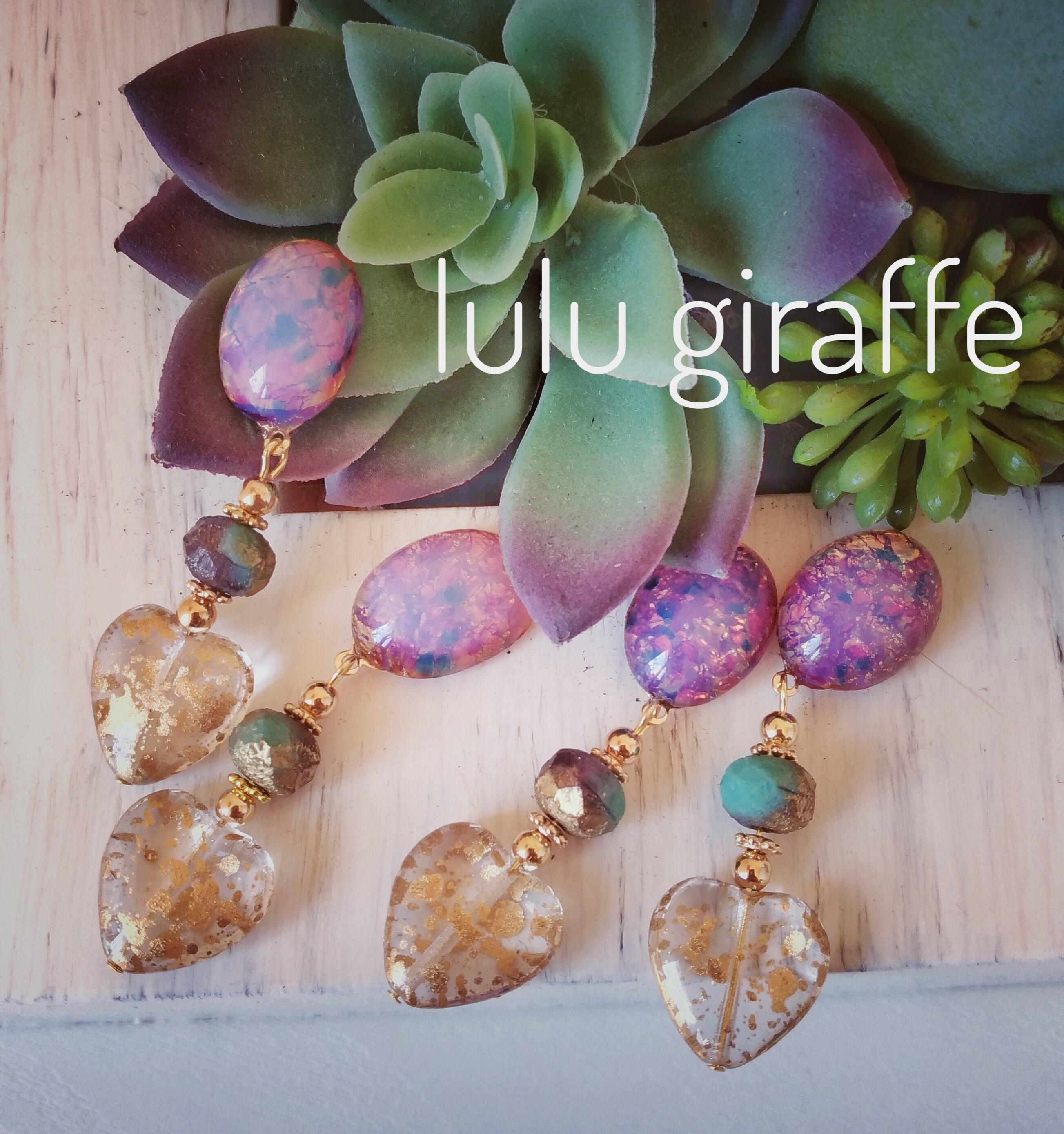 チェコヴィンテージのファイヤーオパールに、ターコイズべっ甲ゴールドのチェコビーズ、金箔ハートビーズをあわせたピアス・イヤリング