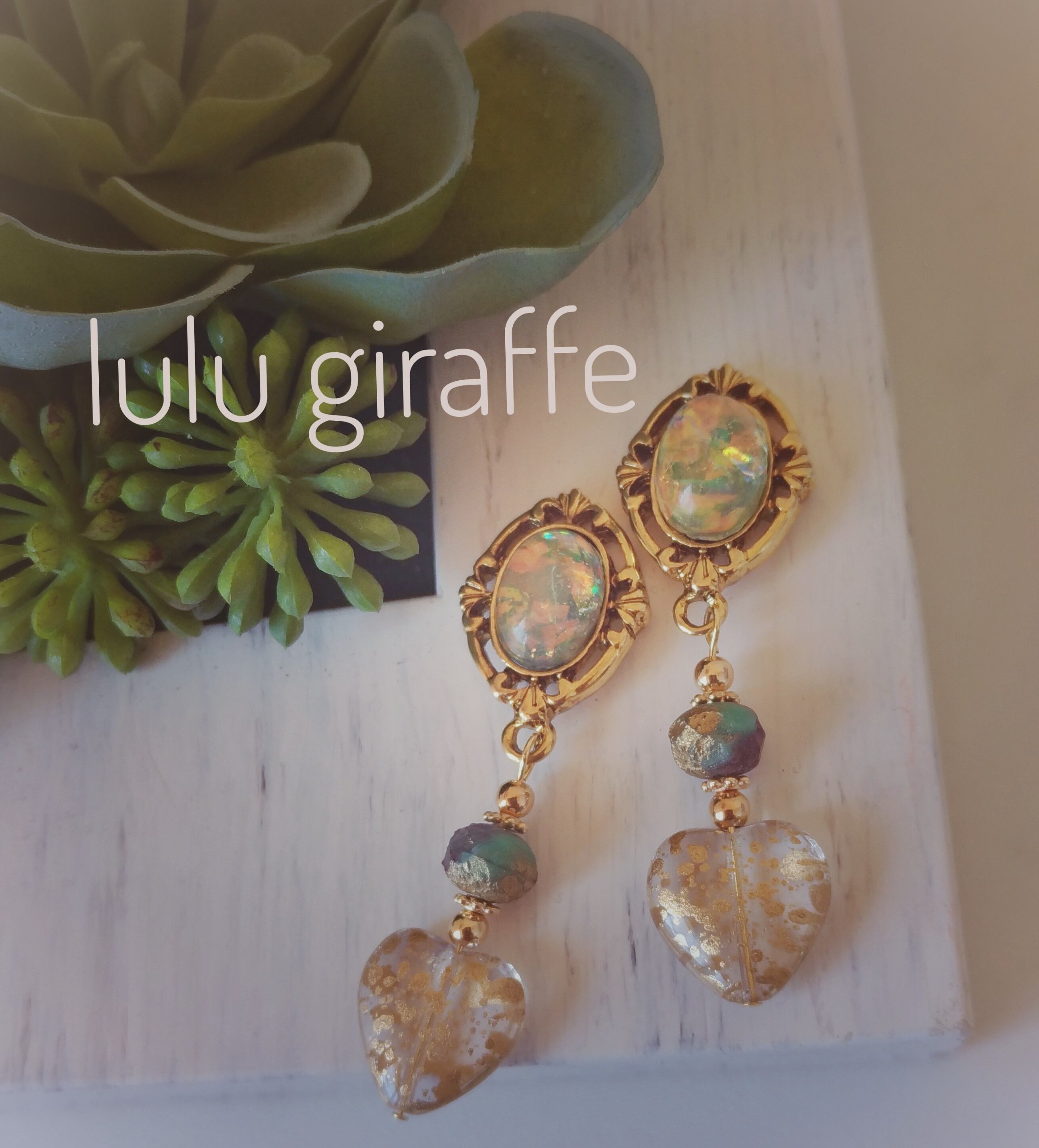 アンティークゴールド台座にオリジナルオパールカボションをあしらい、チェコビーズ、金箔ハートビーズをあわせました。