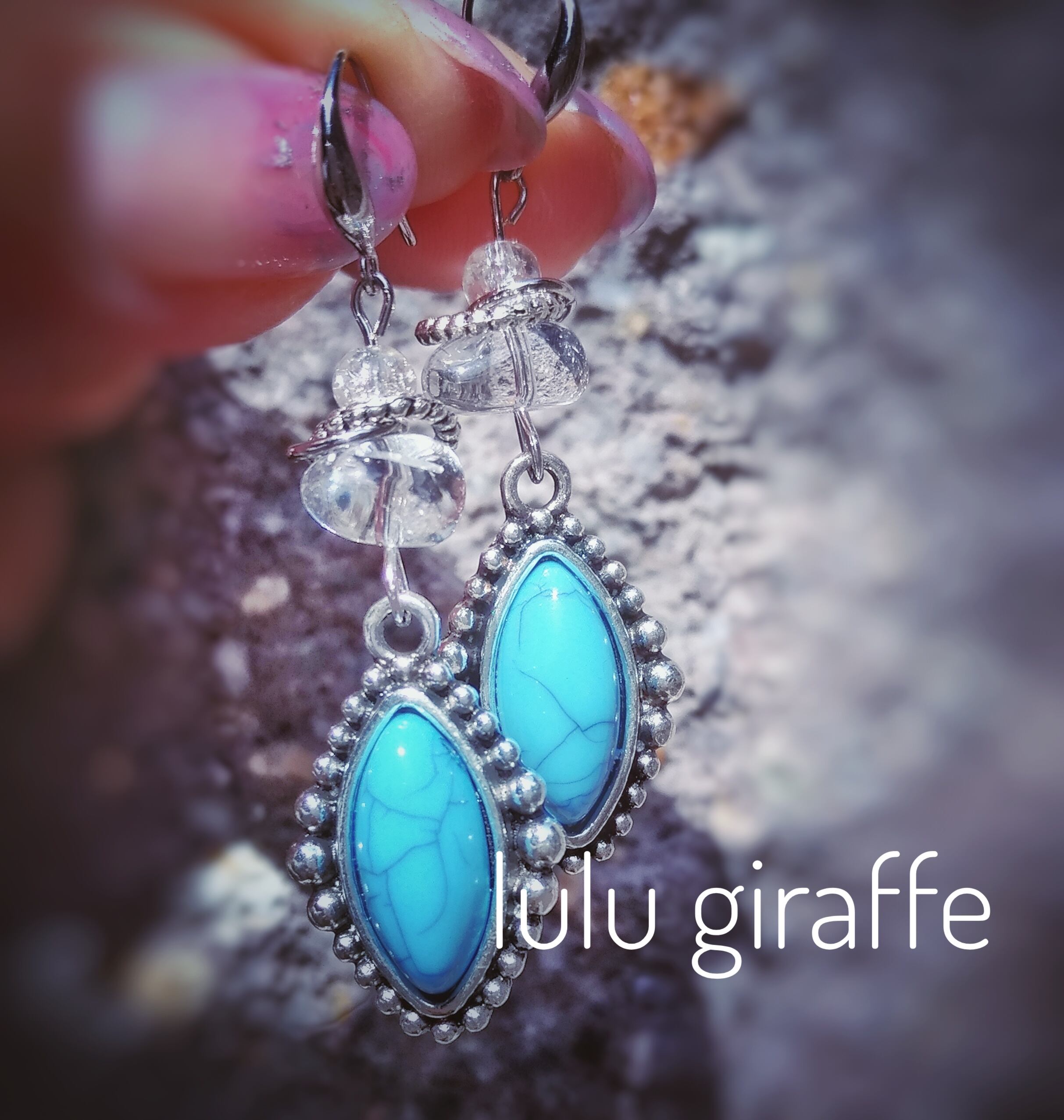 ターコイズのシルバーチャームにクリアビーズを合わせた雫フックピアス