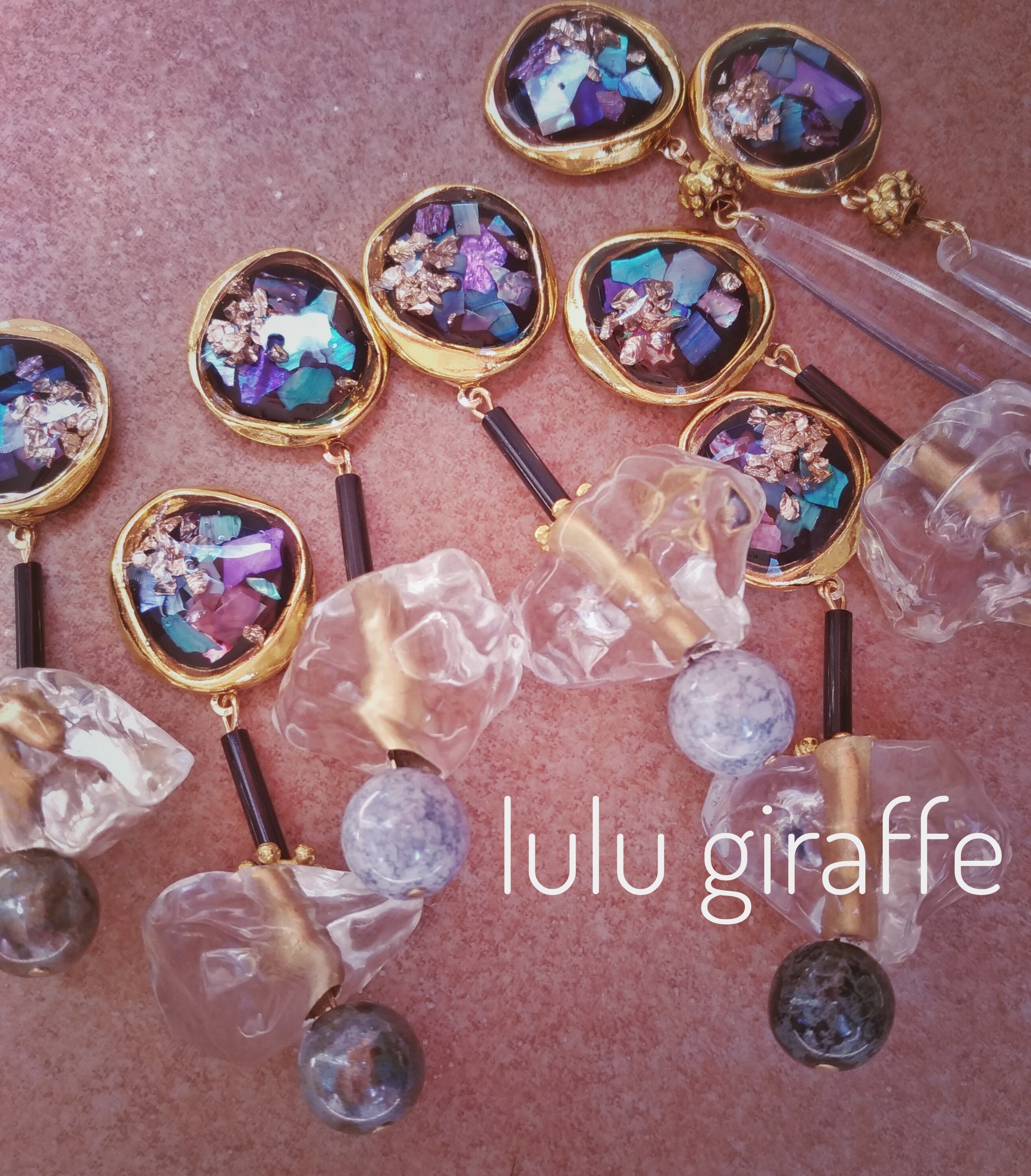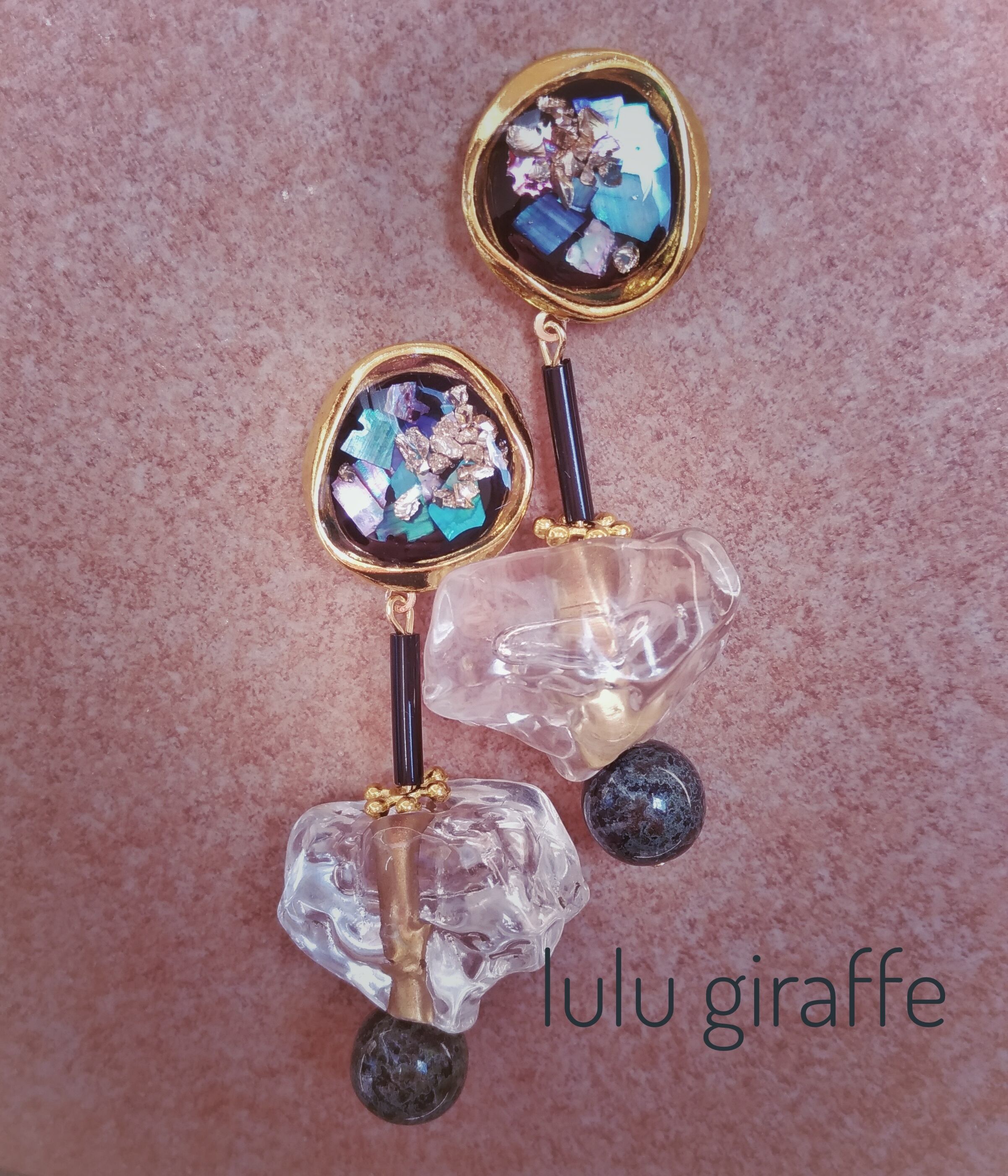 ブラックベースのクラッシュシェルカボションにヴィンテージビーズを合わせたアンティークピアス・イヤリング