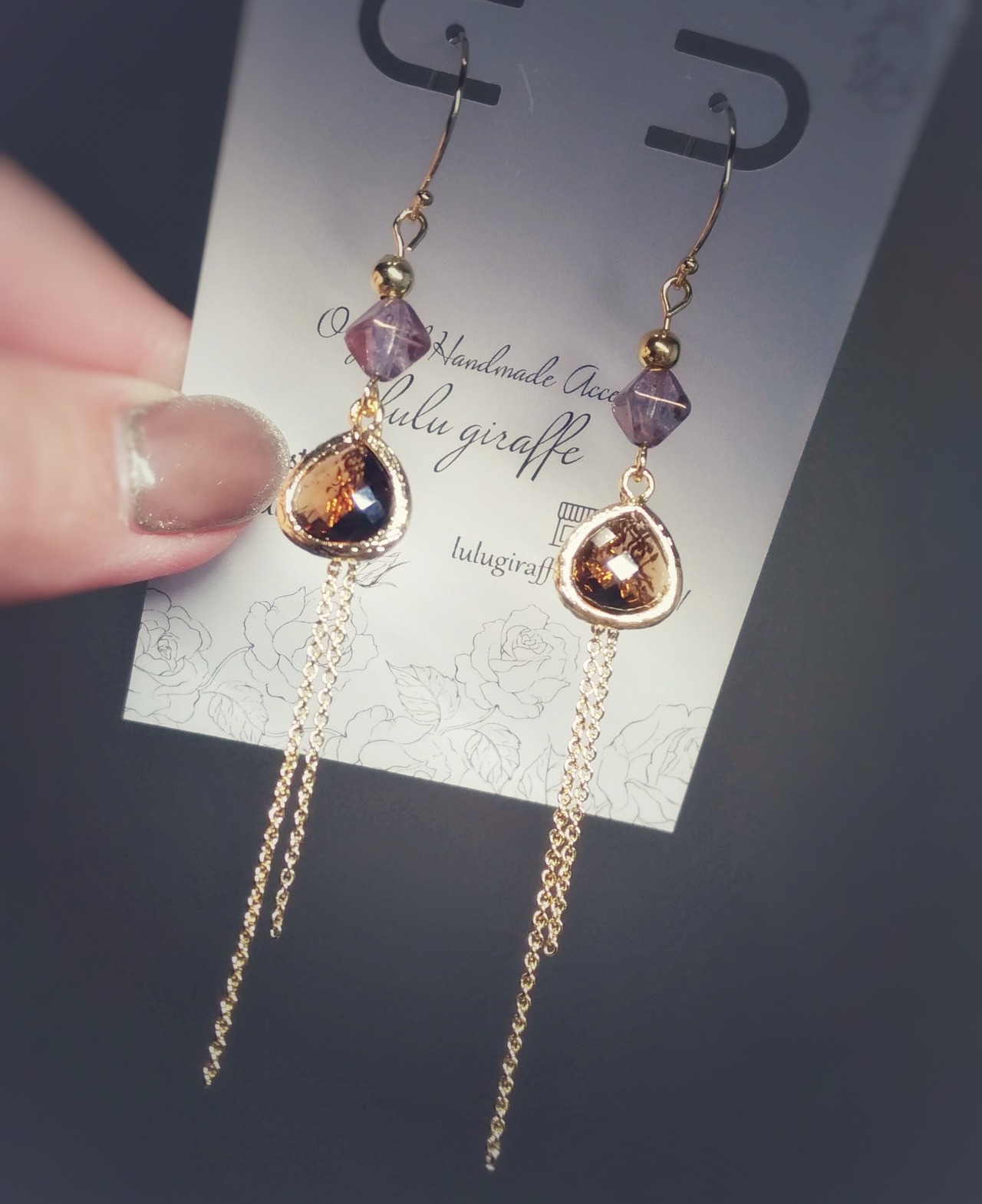 琥珀カラーのスワロフスキービーズにチェコビーズ、ゆらゆら極細チェーンを合わせた大人シンプルピアス♦イヤリング