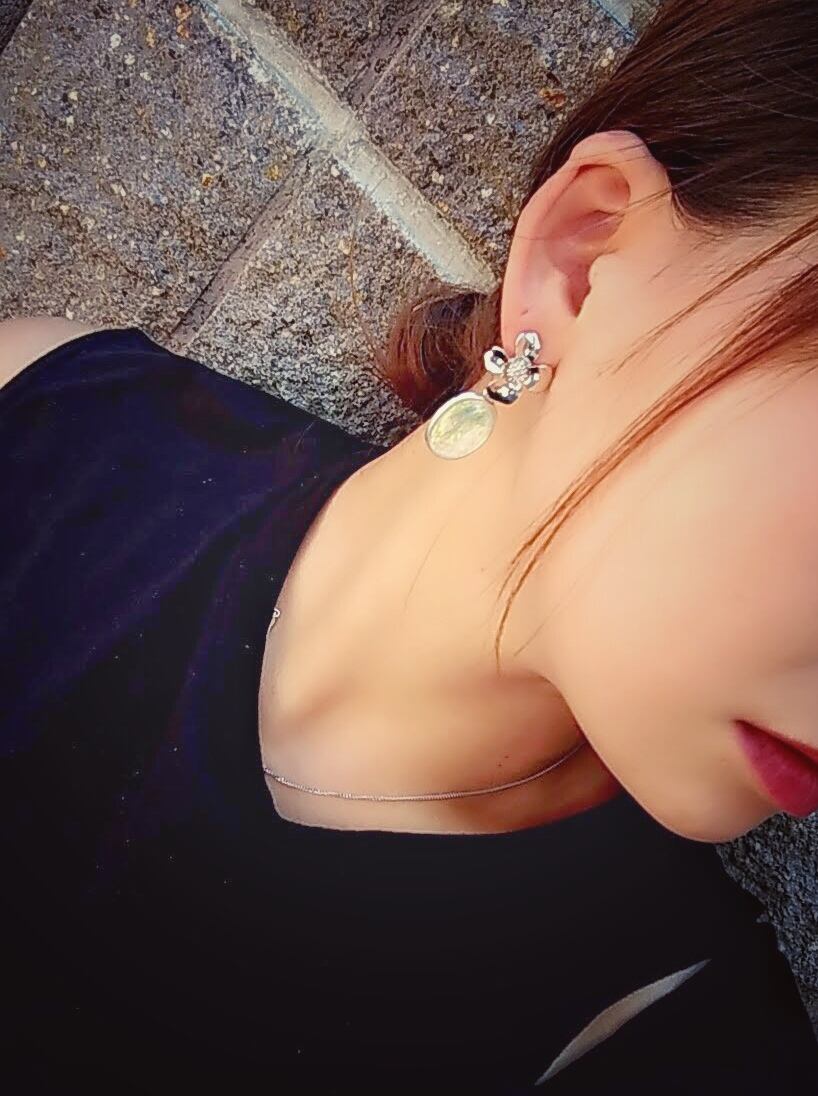 シルバーフラワーに光を受けてオーロラカラーが輝くクリアカボションを揺らしたアンティーク調ピアス