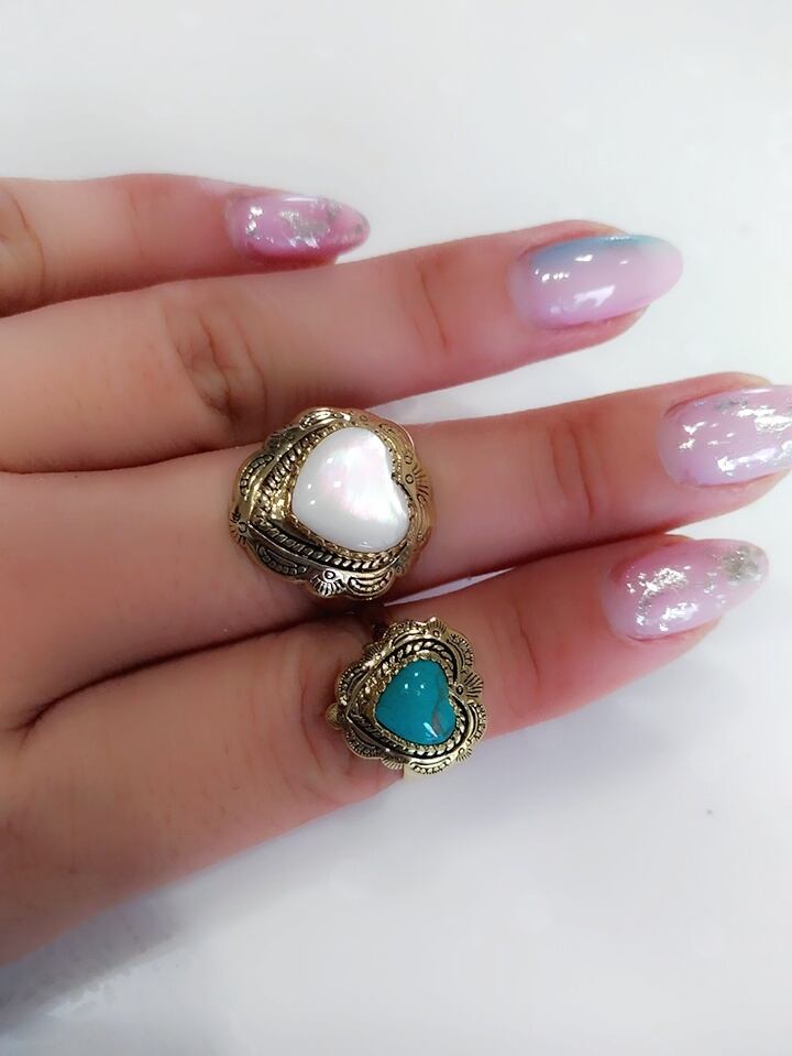 天然ホワイトシェルが中央にあしらわれたアンティークゴールドのハートコンチョリングです。