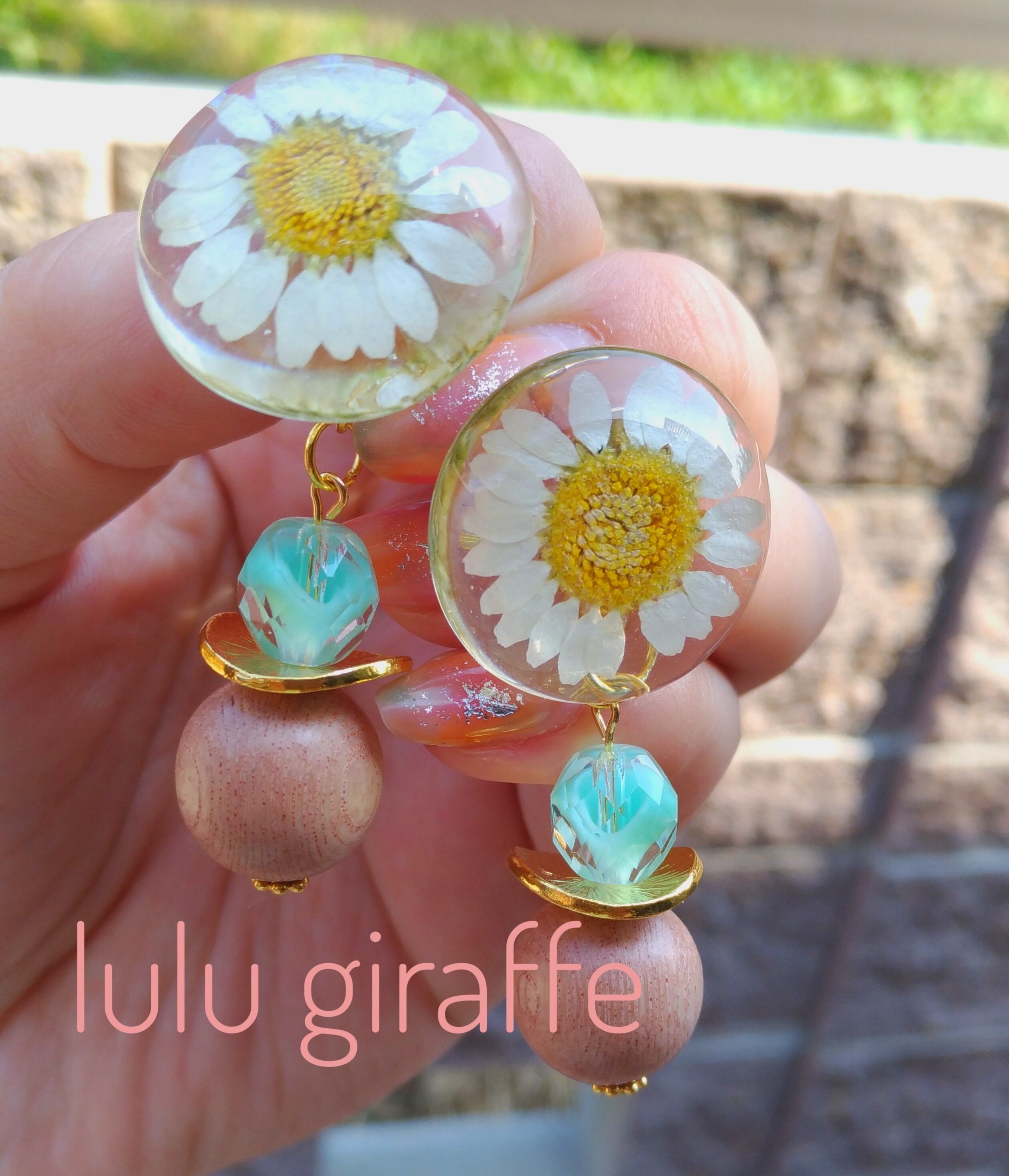 大ぶりクリアのインポートカボションにマーガレットが埋め込まれたフラワーピアス・イヤリング