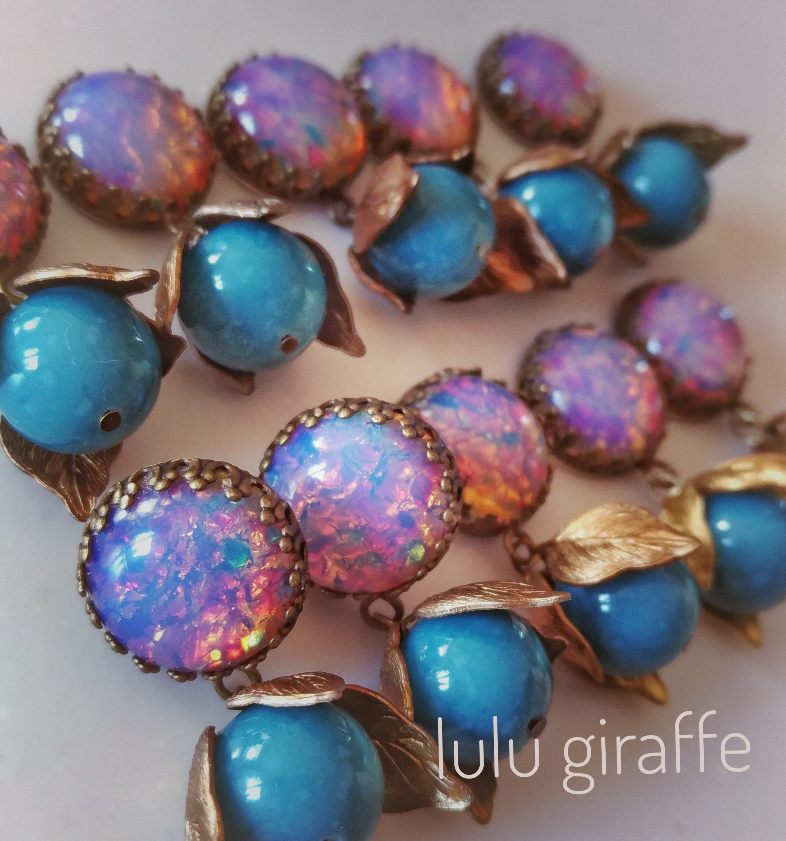 ピンクのオパールはアンティーク台座を使用し、下部には真鍮フラワー×天然石調のエメラルドグリーンビーズをユラユラ♡