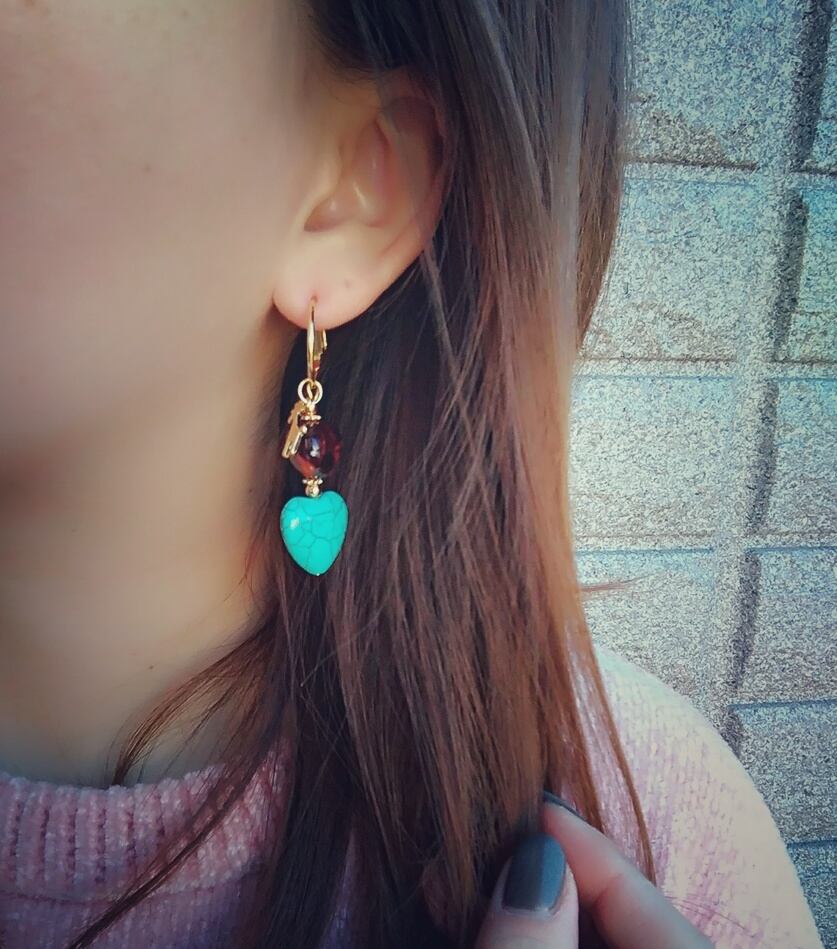 ぷっくり可愛いハートターコイズに琥珀べっ甲ビーズを合わせたピアス・イヤリング